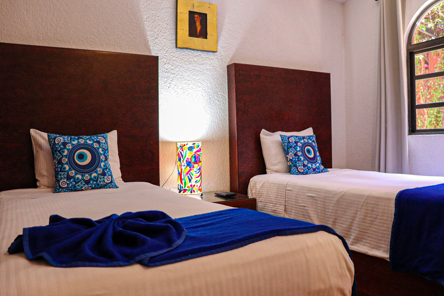 Acogedora habitación ubicada en la planta baja, 2 camas individuales, escritorio, ventilador de torre bajo solicitud, caja fuerte, baño completo compartido.